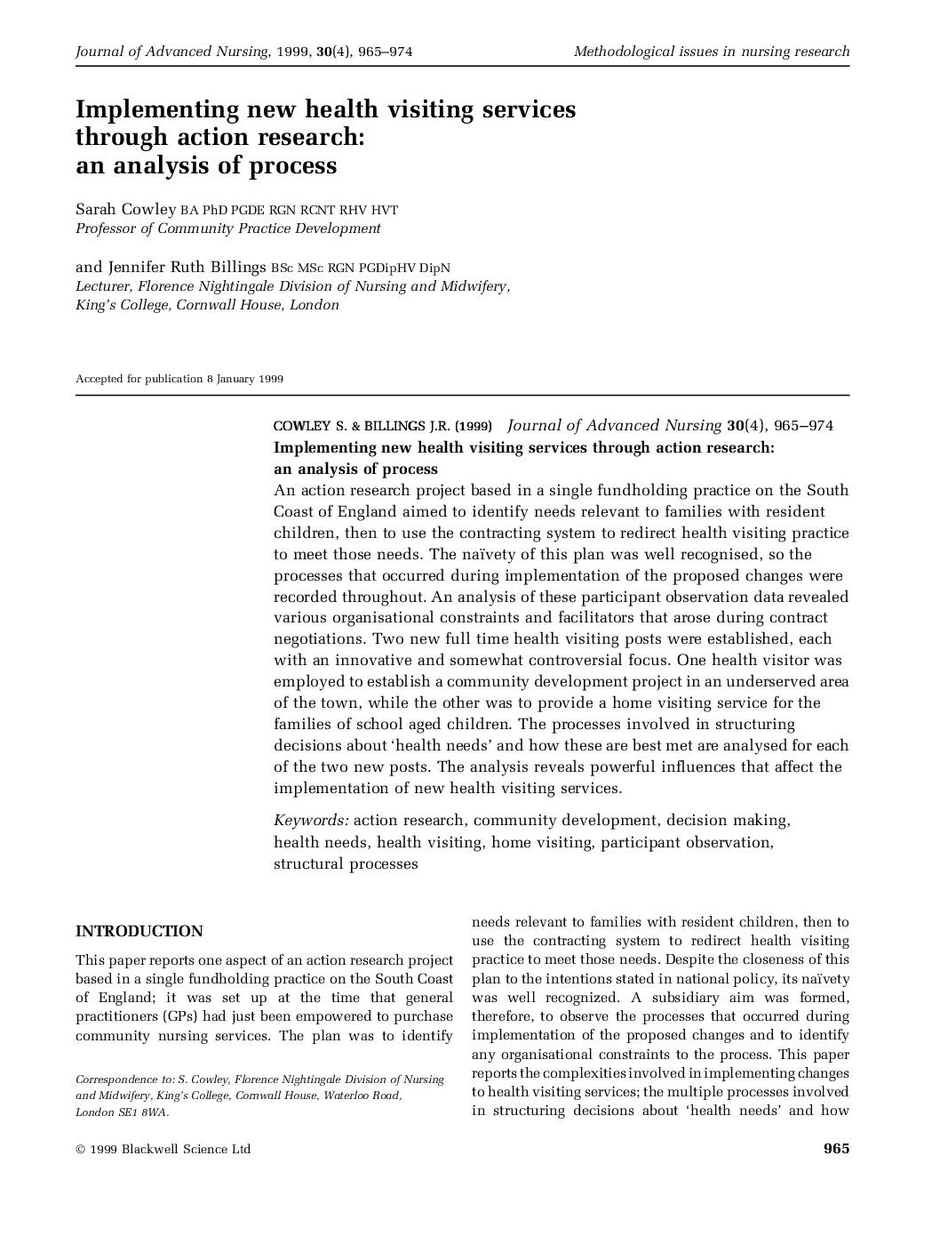 The processes involved in structuring decisions about ‘health needs’ and how these are best met are analysed for each of the two new posts. The analysis reveals powerful influences that affect the implementation of new health visiting services.