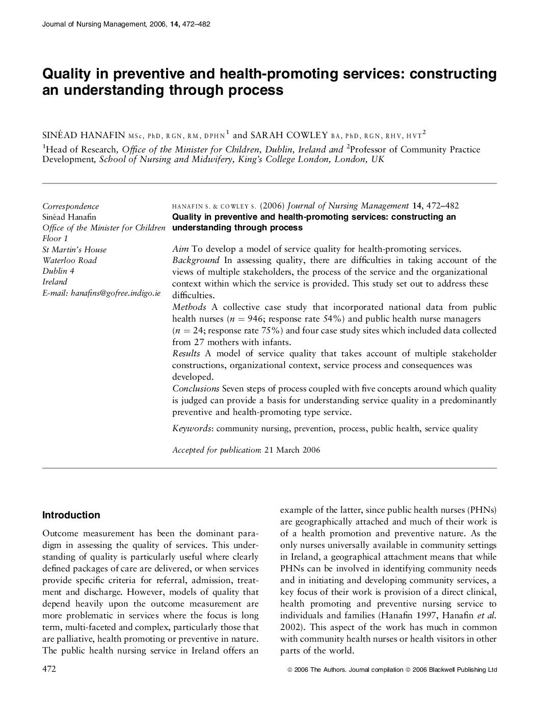 Sinéad Hanafin, Sarah Cowley: Quality in preventive and health-promoting services: constructing an understanding through process. In: Journal of Nursing Management, vol. 14, no. 6, pp. 472–482, 2006, ISSN: 1365-2834, (_eprint: https://onlinelibrary.wiley.com/doi/pdf/10.1111/j.1365-2934.2006.00671.x).