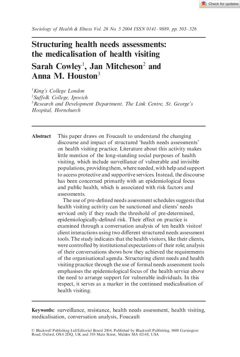 Sarah Cowley, Jan Mitcheson, Anna M. Houston: Structuring health needs assessments: the medicalisation of health visiting. In: Sociology of Health & Illness, vol. 26, no. 5, pp. 503–526, 2004, ISSN: 1467-9566.