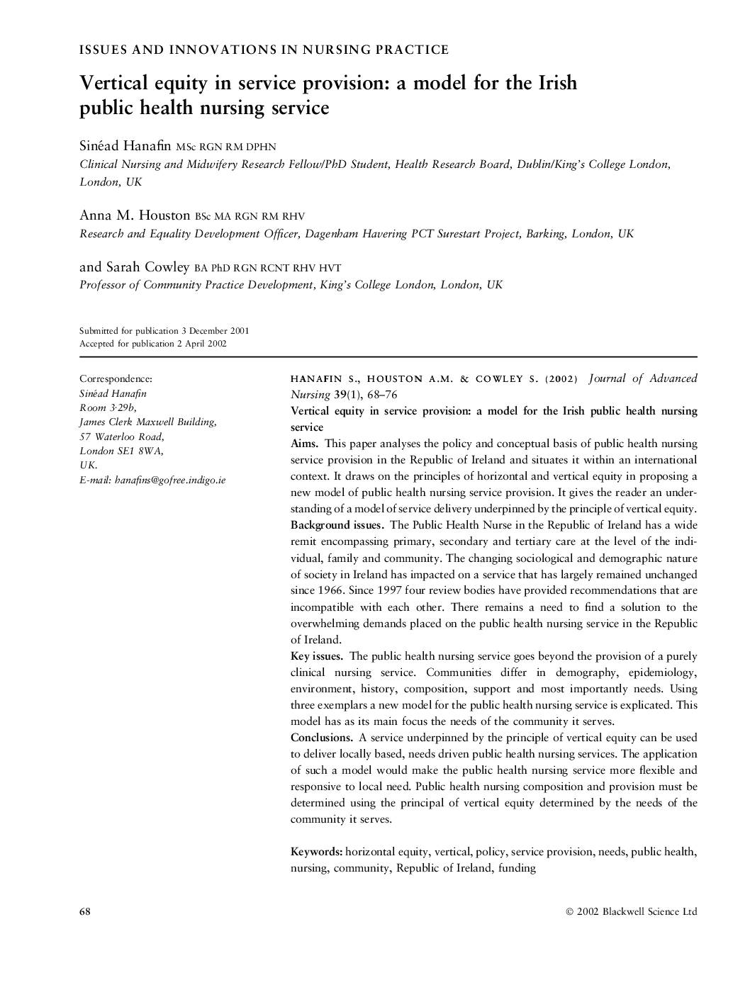 This paper analyses the policy and conceptual basis of public health nursing service provision in the Republic of Ireland and situates it within an international context. It draws on the principles of horizontal and vertical equity in proposing a new model of public health nursing service provision. It gives the reader an understanding of a model of service delivery underpinned by the principle of vertical equity.