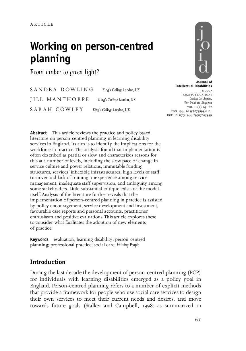 Sandra Dowling, Jill Manthorpe, Sarah Cowley: Working on person-centred planning: From amber to green light?. In: Journal of Intellectual Disabilities, vol. 11, no. 1, pp. 65–82, 2007, ISSN: 1744-6295, (Publisher: SAGE Publications Ltd).